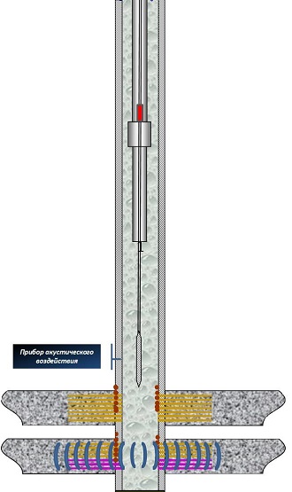 Аппаратура акустического воздействия (АВ) на прискважинную зону пласта позволяет создавать в скважине и прискважинной зоне пласта мощное акустическое поле. Аппаратура АВ состоит из наземного ультразвукового генератора, кабеля и скважинного акустического излучателя. Скважинный акустический излучатель опускают на колонне насосно-компрессорных труб на требуемую глубину. Наземный ультразвуковой генератор питается от сети переменного тока промышленной частоты и служит источником высокочастотной электромагнитной энергии. Питание излучателя осуществляется от наземного ультразвукового генератора по кабелю. Излучатель преобразует энергию электромагнитного поля в акустическую.