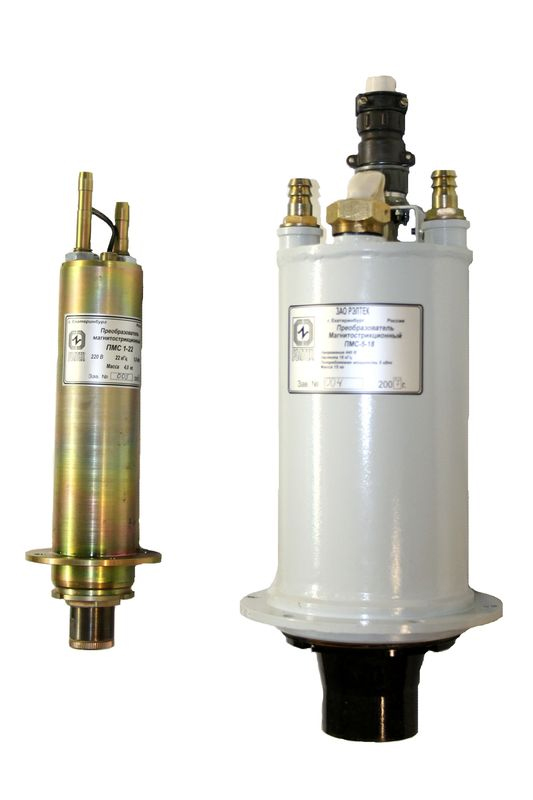 "РЭЛТЕК" выпускает магнитострикционные (МС) и пьезоэлектрические (ПЭ) излучатели. Наиболее распространённым материалом для изготовления магнитострикционных преобразователей (МС) является сплав пермендюр. Достоинством МС преобразователя является возможность передачи в единичный излучатель мощности до 5 кВт, что чрезвычайно важно для построения мощных ультразвуковых систем и повышения надёжности их работы.