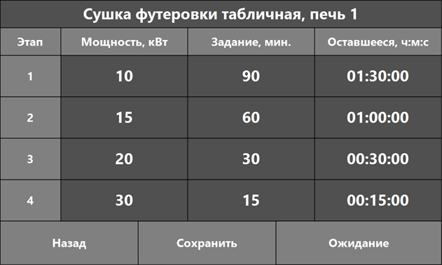 Заказчиком было отмечено удобство в управлении плавильной установкой. На новом контроллере Агава ПЛК-70 10′ с touch screen монитором разработан понятный интерфейс для обслуживающего персонала Заказчика. Работа на установке не требует специального обучения. После проведения инструктажа от компании «РЭЛТЕК» специалисты Заказчика смогли без труда освоить навыки по обслуживанию оборудования. Стоит отметить в системе управления наличие 2 режимов сушки и спекания футеровки. Первый режим - автоматический режим в табличной форме.